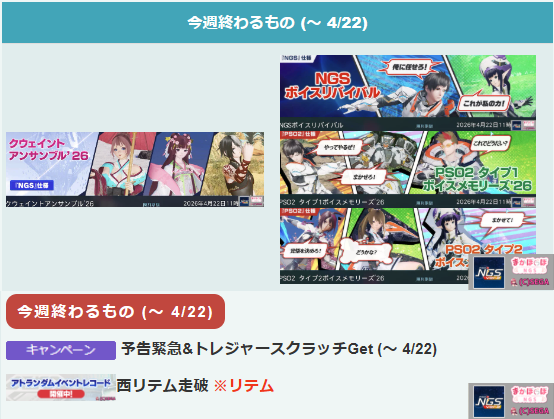 PSO2NGSで、4月22日のアプデ内容と終わるものまとめ。