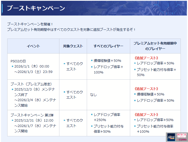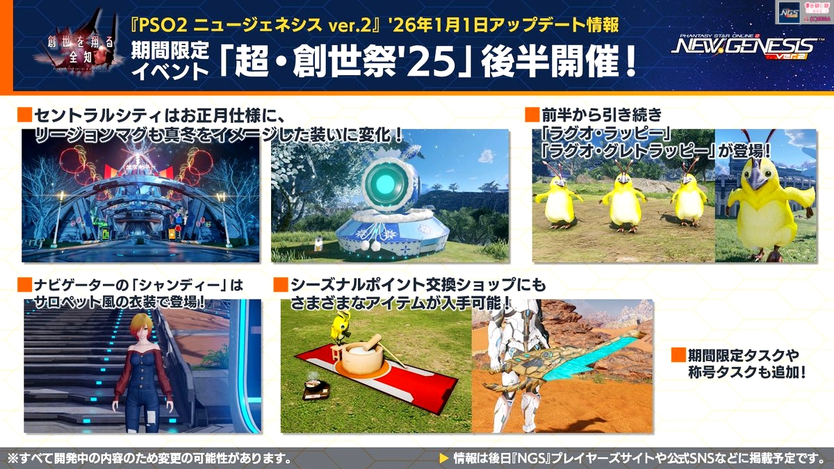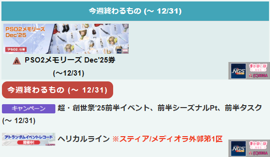 PSO2NGSで、12月31日と2026年1月1日のアプデ内容と終わるものまとめ。