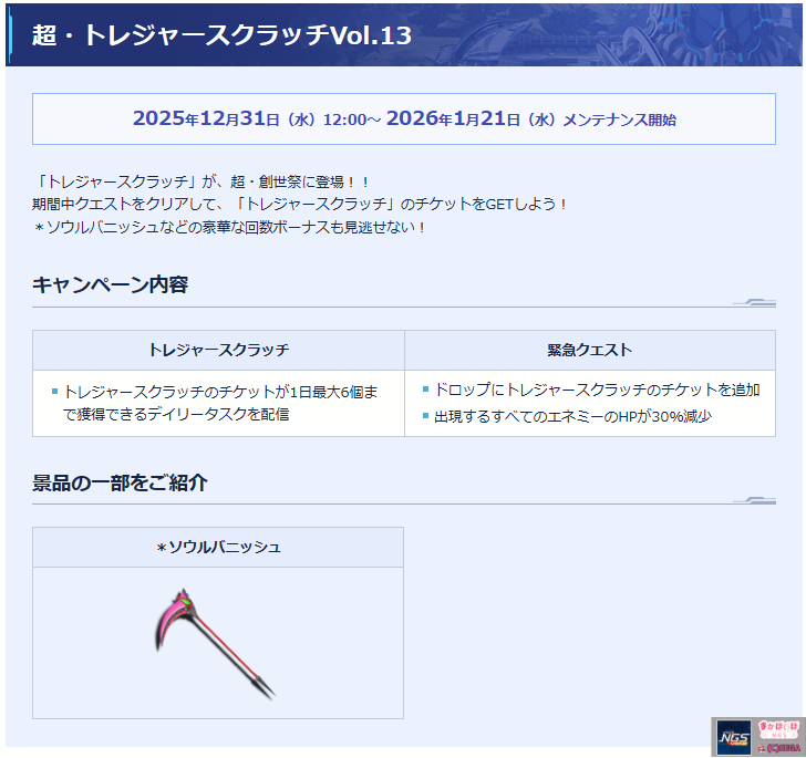 - 12月31日12時~ トレジャースクラッチが再び開催 ※緊急HP30%減少