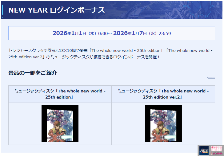 - NEW YEAR ログインボーナスでミュージックディスクが貰える